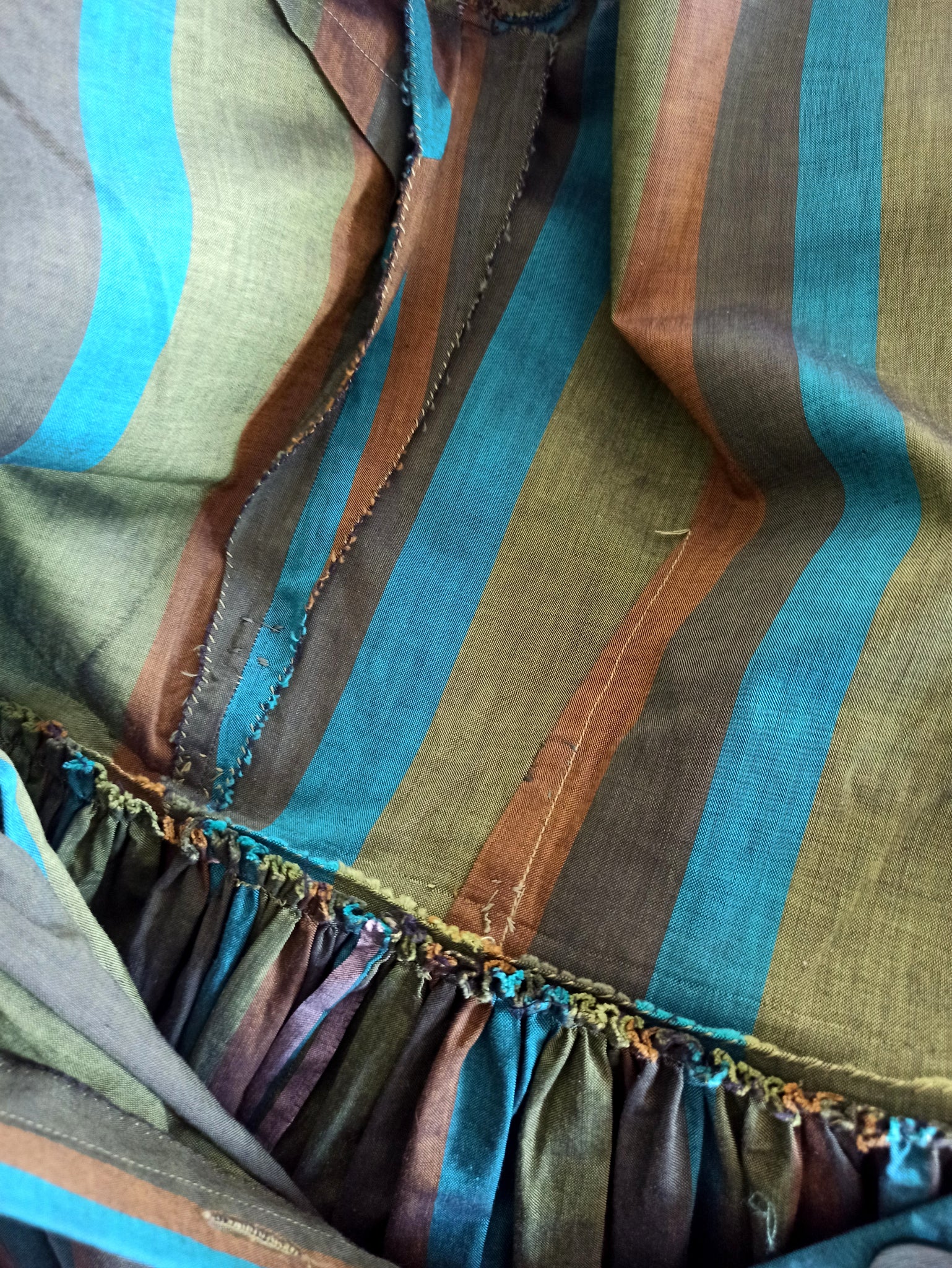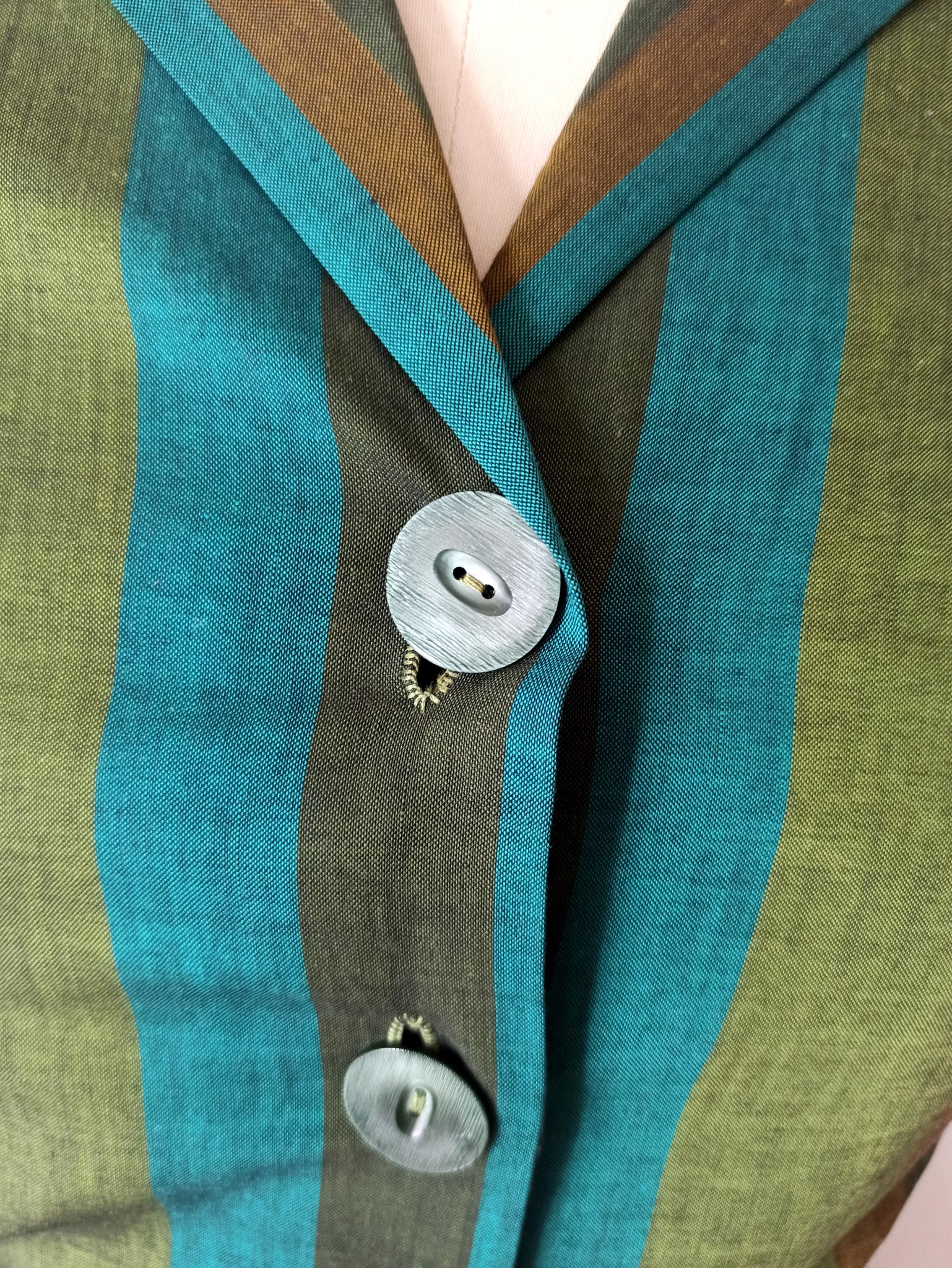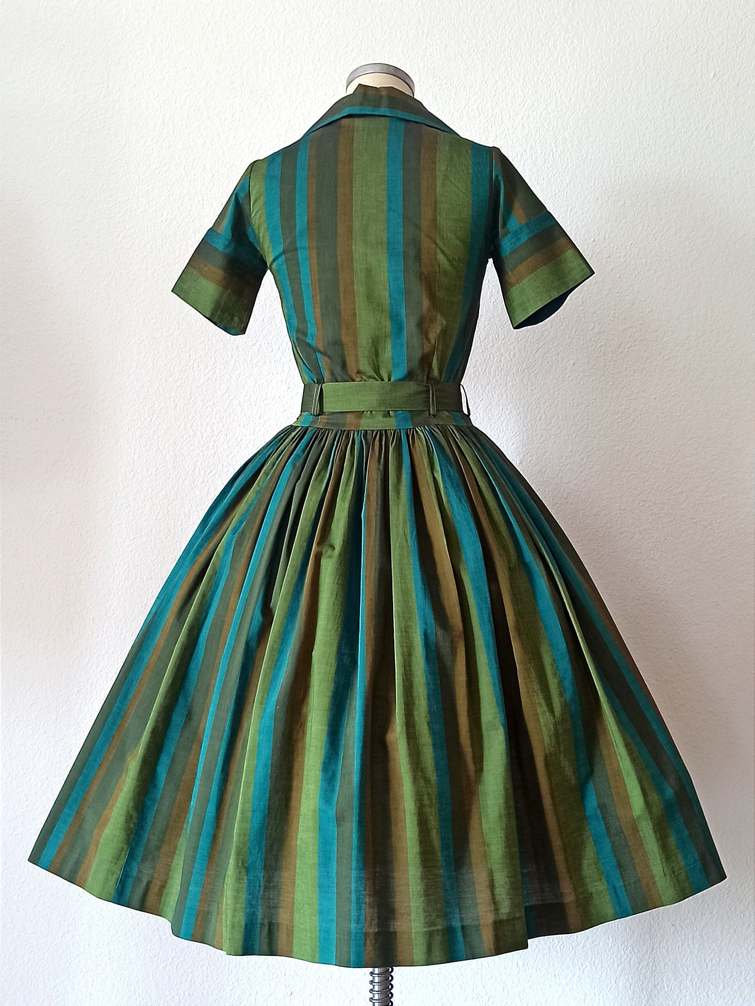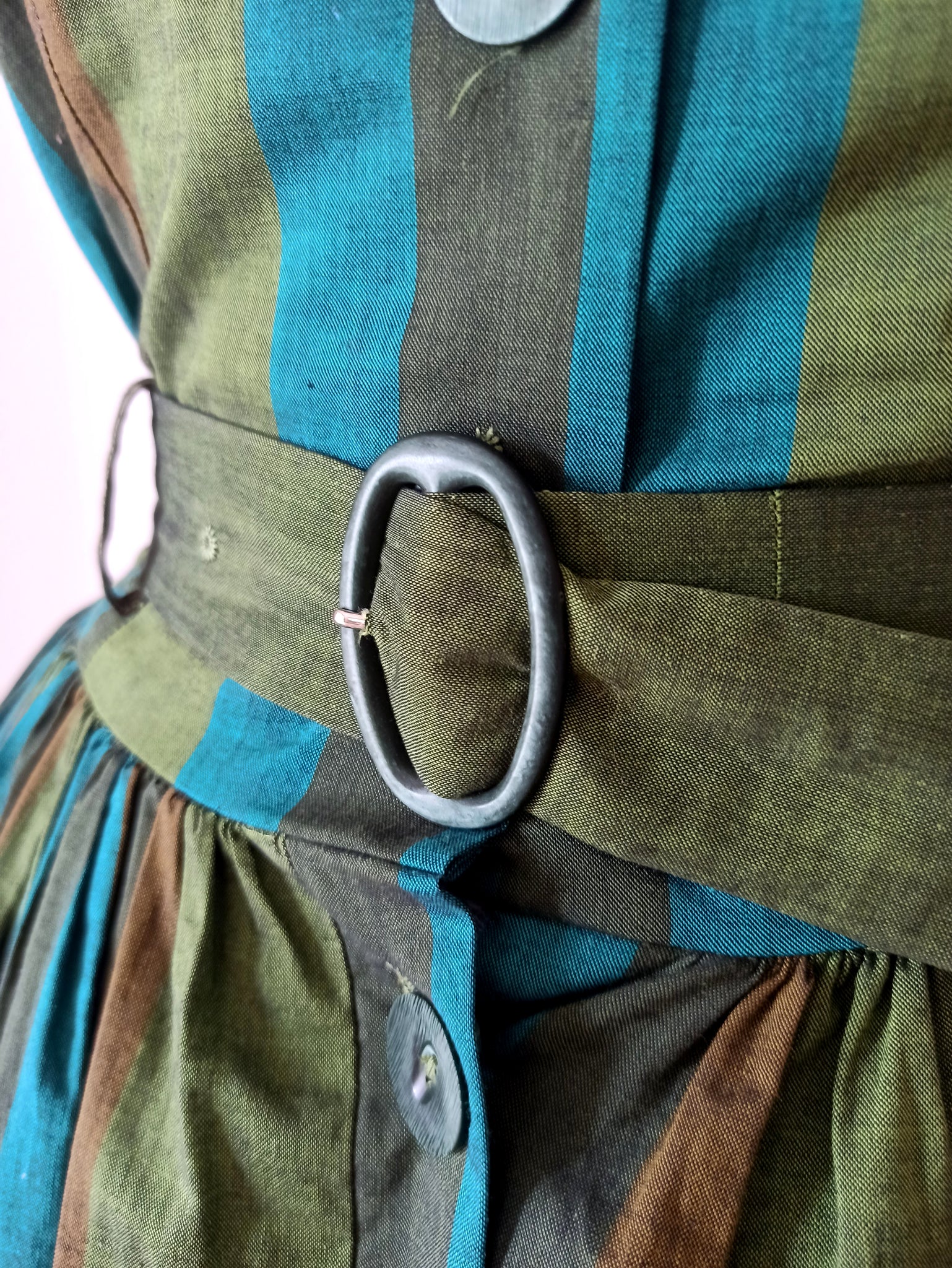 This is a truly spectacular dress from the 1950s in unworn condition. The fabric is cotton with a precious and autumnal combination of colours. She has an exquisite design with very original sleeves, a fabulous shirt collar, matching belt and an amazing gathered skirt. She closes with front buttons. This dress has no label but it is defenitely a top quality garment.