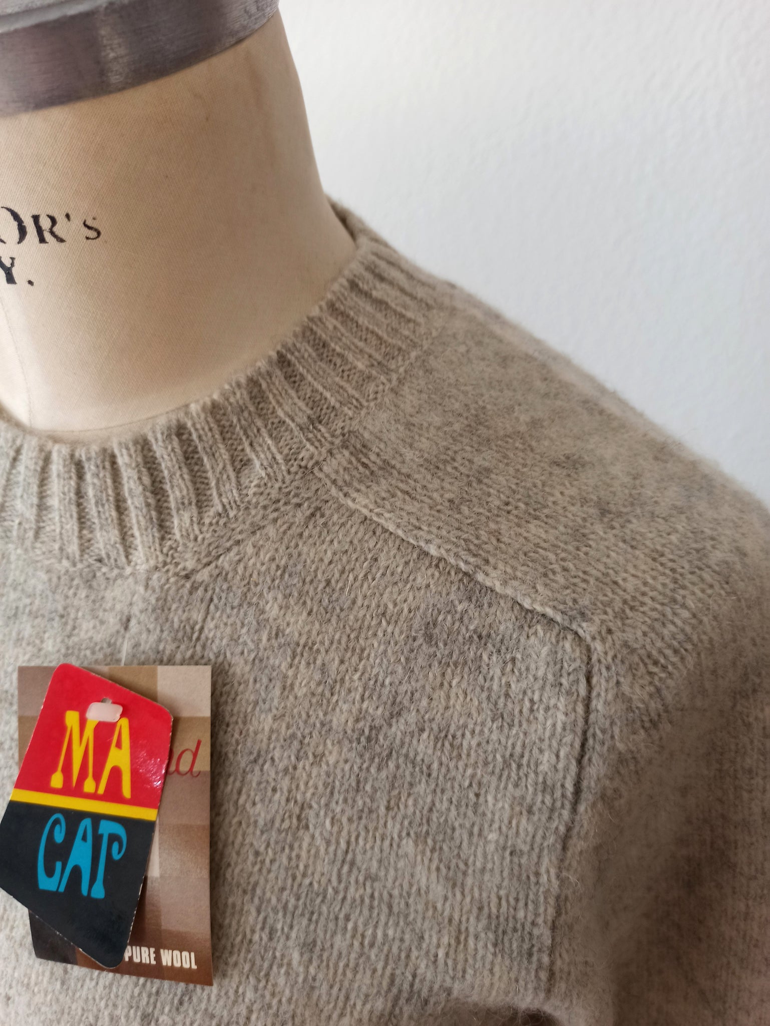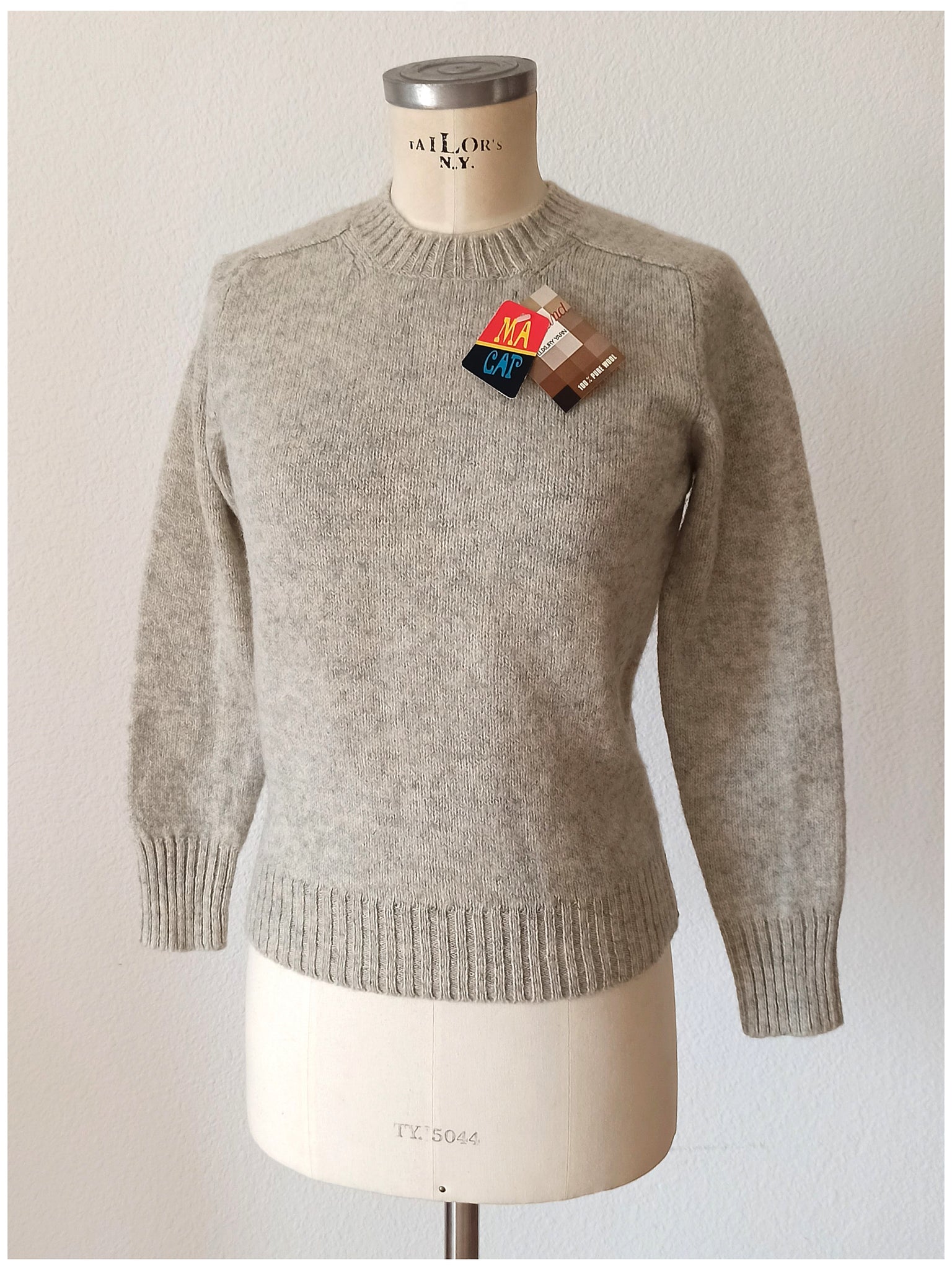 This is a gorgeous sweater from the 1960s by MACAP, Spain. Deadstock condition with original tags. 100% Wool. Color is grey. Tag reads size 5.